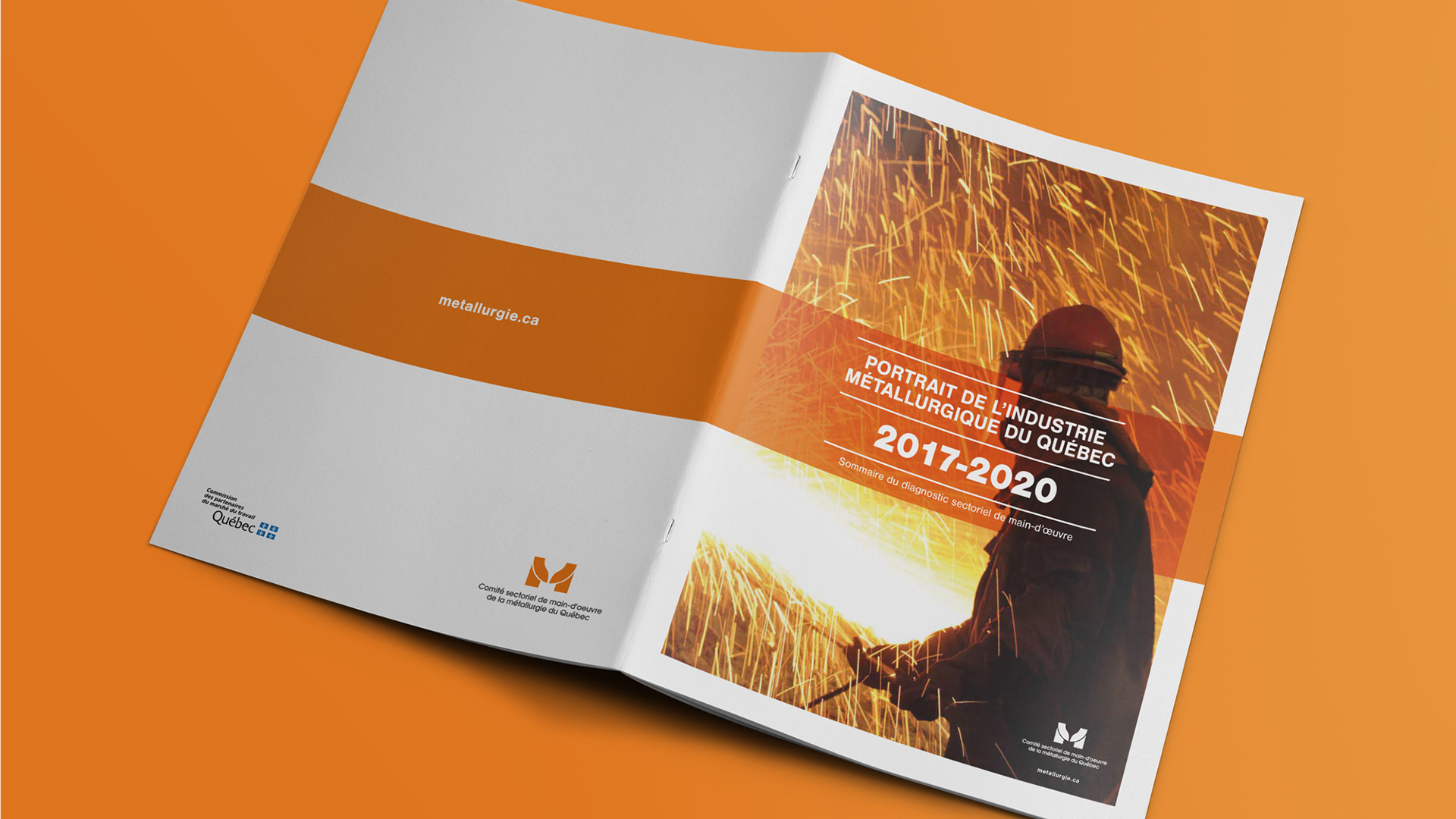 Design de la brochure du sommaire du diagnostic sectoriel de la main-d'œuvre, produit par le Comité Sectoriel de Main-D'Œuvre de la Métallurgie du Québec. En collaboration avec Tesla RP.